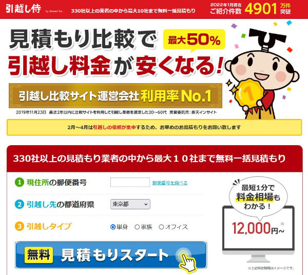最大差額50%OFFの引越し侍は最短1分で相場も分かる一括見積もりサービスです。