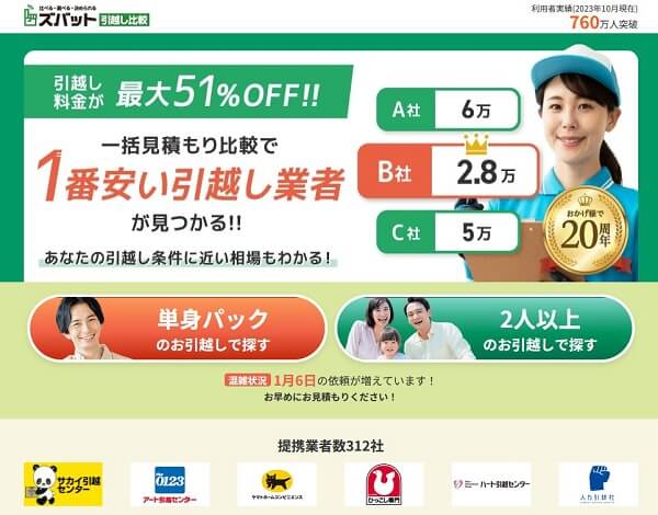 ご利用者の人数が760万人以上と安く荷物を運んでもらいたい方へ大きく貢献しているのがズバット引越し比較です。